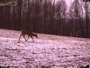 The snow has finally melted and the deer are now separating from the winter herd. After a long snowy winter where the deer herded into groups of 10 to 100, the herds have broken up and the deer are returning to their old haunts. In this case the deer is visiting last years food plots from 2012.