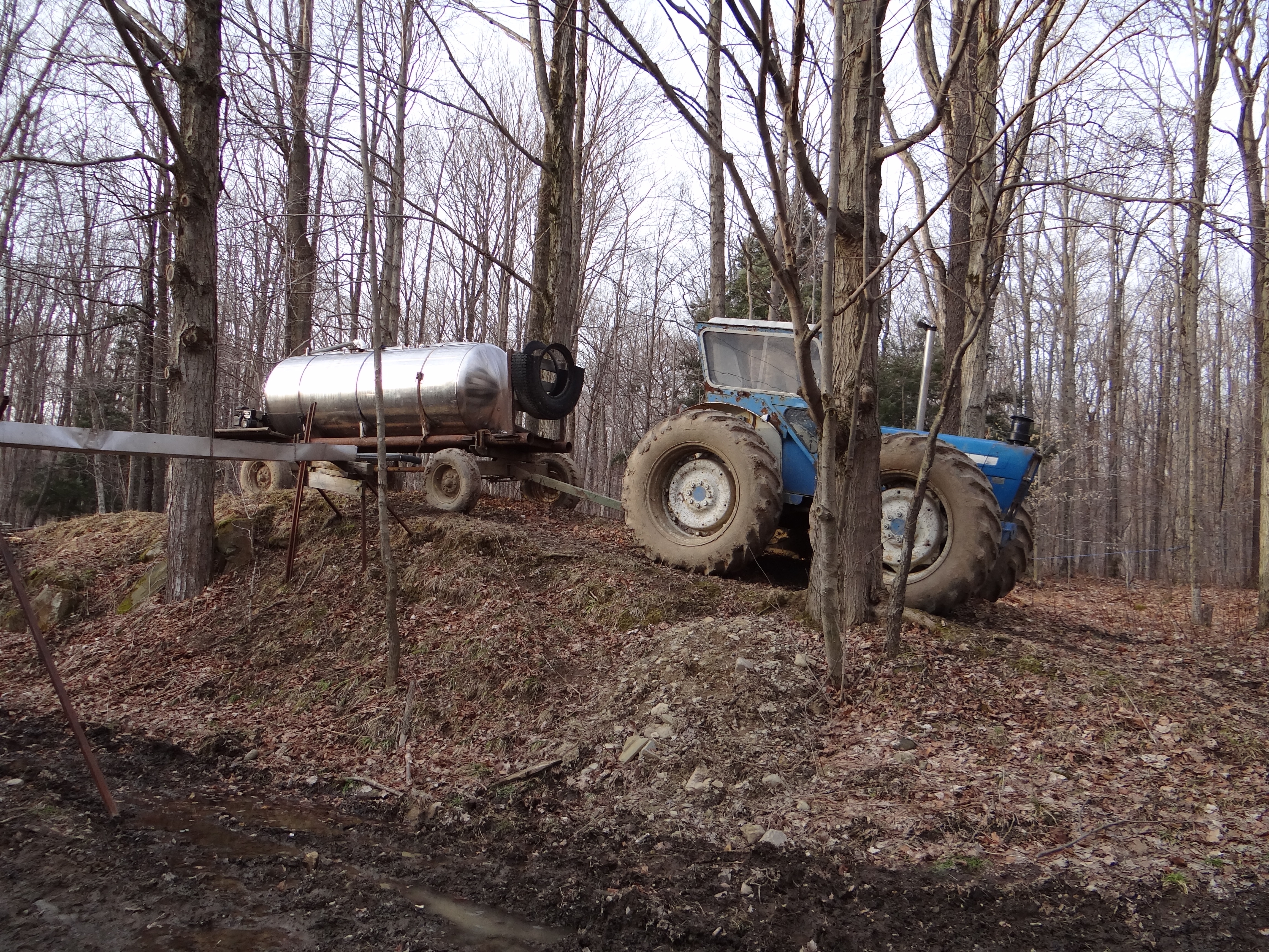 The maple tree forest and the building where the syrup is made is called a Sugarbush. A large sugarbush will have more than one collection point for the sap. A tractor and portable stainless steel tank is used to transport the sap from the collection points back to the Sugarbush building where the fresh sap is made into maple syrup.