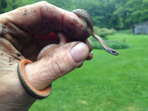 In western NY State we have seen Northern Red Belly Snakes for 50 years. They hang out on our south facing back door stoop which is basically a very large flat stone which backs up to the concrete foundation. There are some other joining stones which provide hiding spaces for the snakes. The snakes are attracted to this area because the rocks hold heat. The warm rocks warm the cold blooded snakes. We used to call these snakes “Red Bellied Racers”. This door stoop area is also attractive to garter snakes. They both seem to be comfortable sharing the same space. Both types of snakes are relatively harmless small to mediums size snakes. We could classify the Red Belly Snake as a small snake. It only gets to be about a foot long (12 inches). The Red Belly Snake is a very friendly, easy to handle snake.