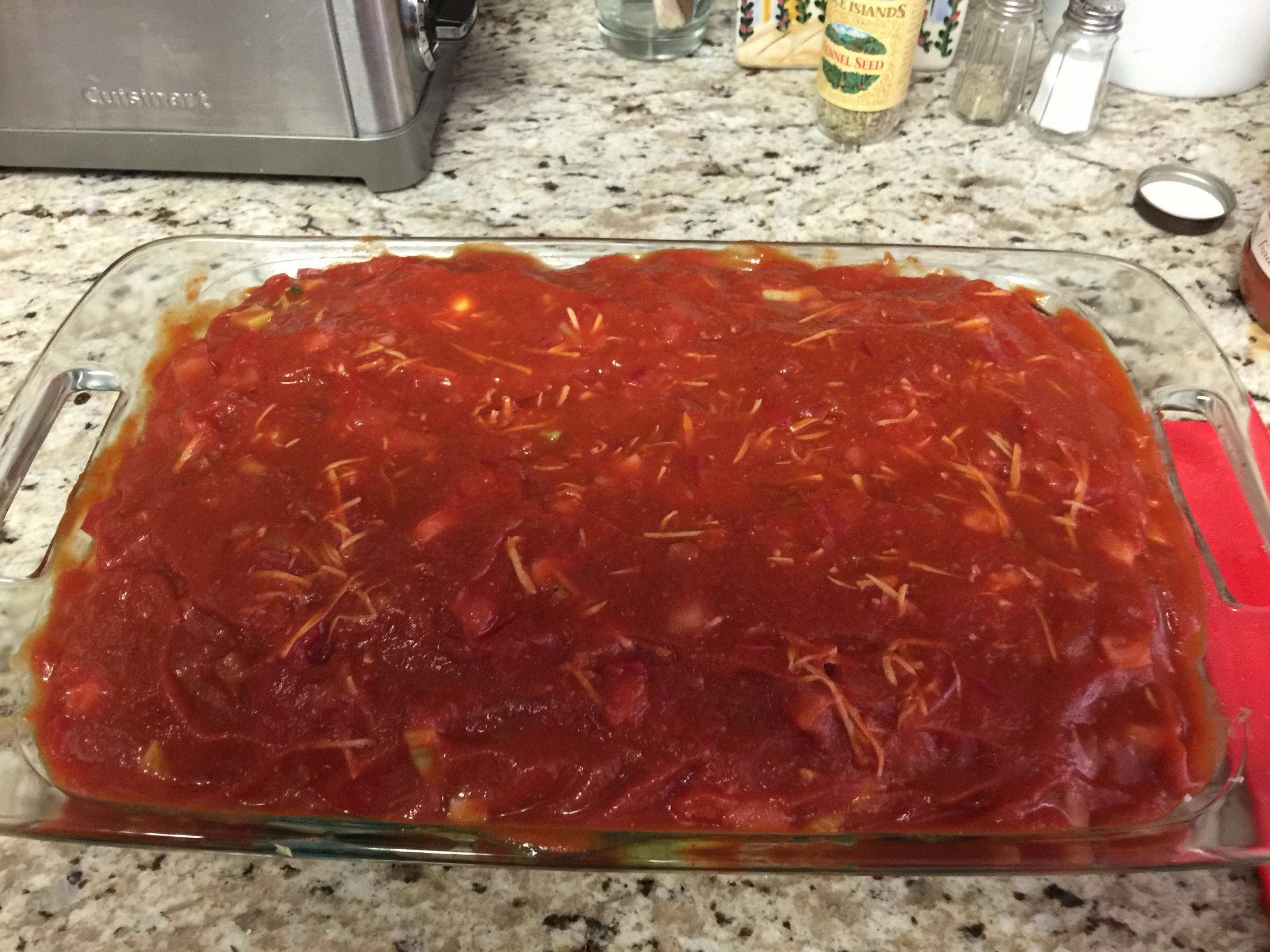 13) When finished with the top layer, spread pasta sauce thickly over the entire top of the casserole.